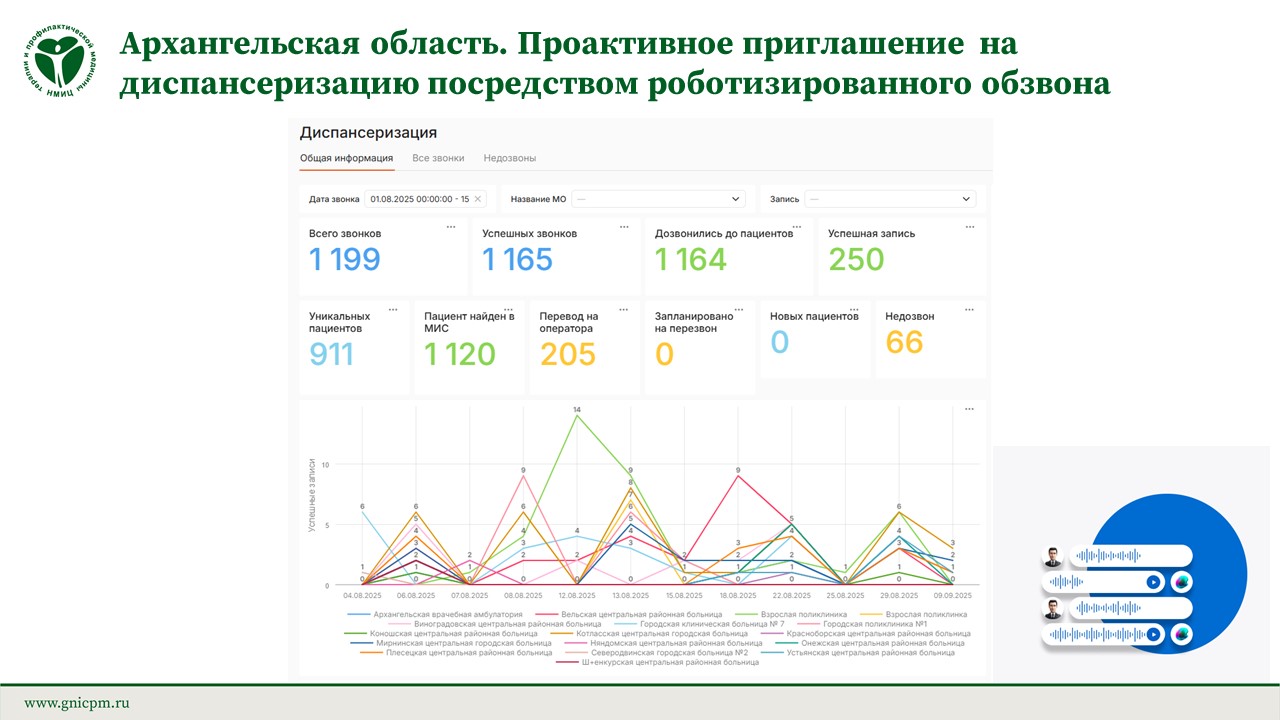 В Архангельской области с июня по ноябрь 2025 года был реализован региональный проект «Здоровое Поморье». В рамках проекта, в том числе проводилась и диспансеризация. Проактивное приглашение на диспансеризацию осуществлялось посредством роботизированного обзвона, была осуществлена интеграция с РМИС и расписание структур медицинской профилактики.