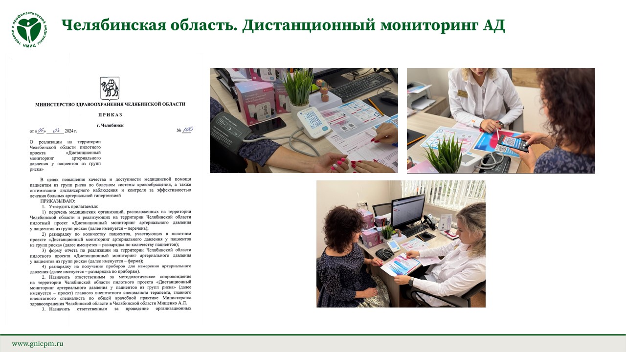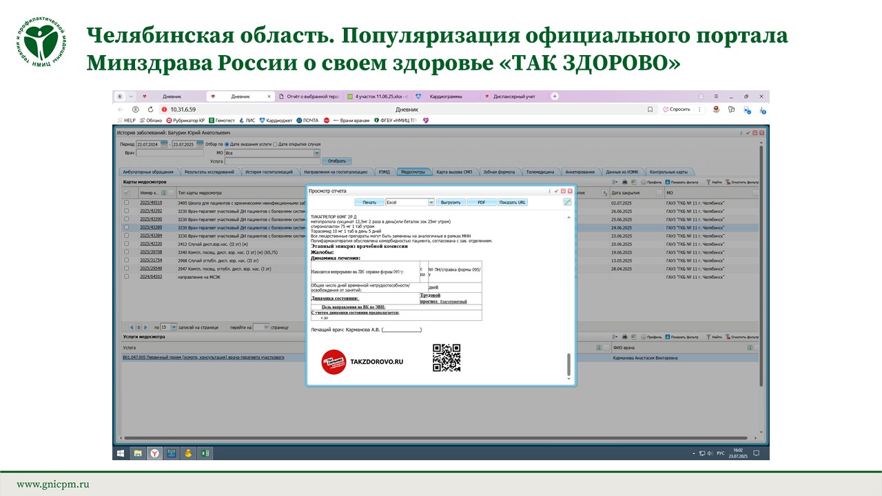 При методической поддержке НМИЦ ТПМ доработана РМИС Барс Челябинской области в части выделения, мониторинга и контроля за приоритетной группой диспансерного наблюдения на участке врача-терапевта участкового. В настоящее время проходит финальное тестирование и внедрение в «якорной» медицинской организации по «терапии», последующее внедрение во все МО ПМСП в течении 2025 года