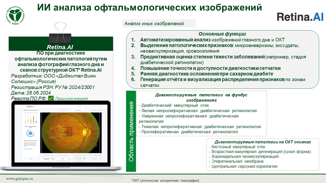 ПО при диагностике офтальмологических патологий путем анализа фотографий глазного дна и сканов структурной ОКТ* Retina.AI Разработчик: ООО «Диджитал Вижн