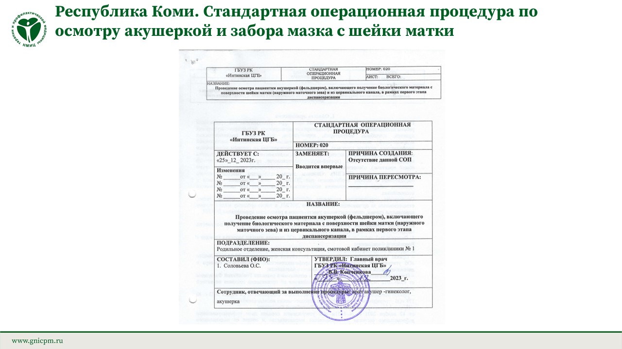 На основании методических рекомендаций ФГБУ «НМИЦ ТПМ» Минздрава России в каждой медицинской организации Республики Коми разработаны и внедрены стандартные операционные процедуры «Проведение осмотра пациентки акушеркой (фельдшером), включающего получение биологического материала с поверхности шейки матки (наружного маточного зева) и из цервикального канала, в рамках первого этапа диспансеризации».