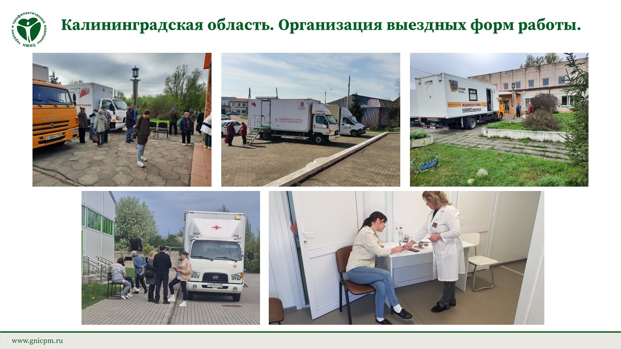 Под методическим руководством НМИЦ ТПМ ЦОЗиМП области организован Проект "Калининградская область - здоровье в каждый дом". Централизованный подход к формированию передвижных форм работы по руководством ЦОЗиМП, со всех МО собирают ПМК и по графику выезжают на села или предприятия